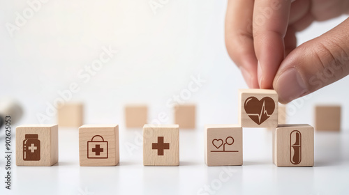 Hand placing wooden blocks with health and medical icons on them, representing the concept of healthcare security in business