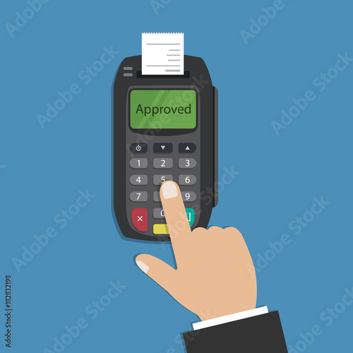 Hand presses the buttons of the pos terminal. Vector illustration on a blue background