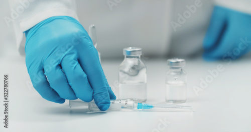 Hand putting filled syringe on table next to medical glass vials with transparent liquid, cropped