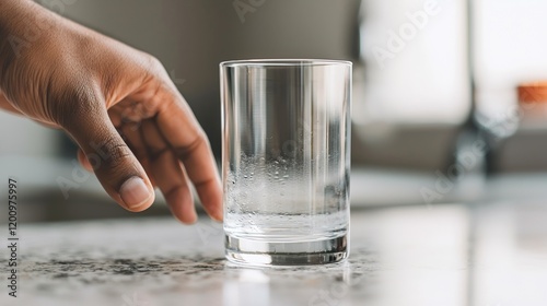 Hand Reaching for Glass of Water on Marble Surface, Clean water promotes health and vitality concept.