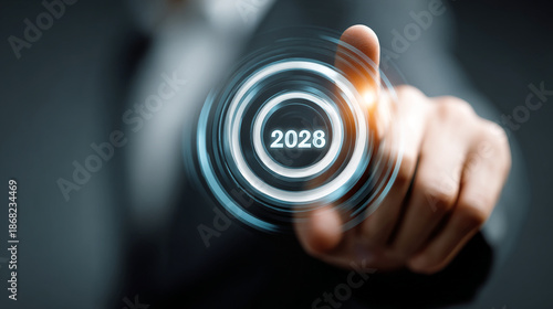 Hand Reaching to Press a Glowing Digital Button for the Year 2028