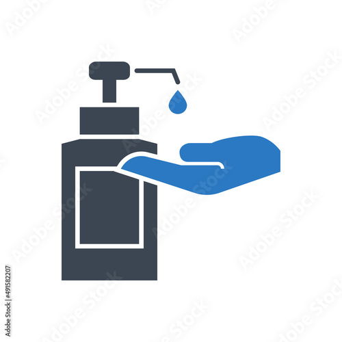 Hand sanitizer related vector glyph icon. Sanitizer dripping from bottle on palm. Hand sanitizer sign. Isolated on white background. Editable vector illustration