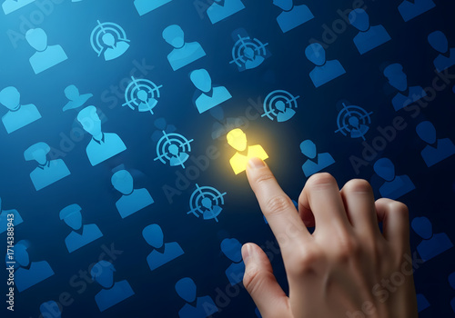 Hand selecting a glowing person icon from a grid of blue icons representing a recruitment or human resources concept