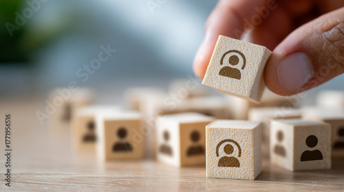 Hand selecting a wooden block with a user icon from a group representing teamwork, recruitment, or human resources management concept on table surface