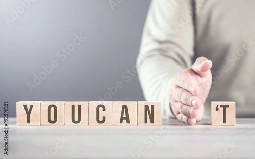 Hand separates the letter "T" from the word "you can't" transforming it into "can." The image symbolizes overcoming obstacles, shifting from doubt to empowerment, and embracing a positive mindset