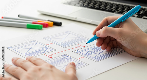 Hand sketching website wireframe, using blue pen, on white paper. Illustrates web design process, creativity, and planning