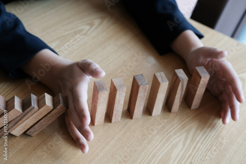 hand stopping effect of domino continuous toppled. busineeman protecting falling wood block. solution & strategy in business.