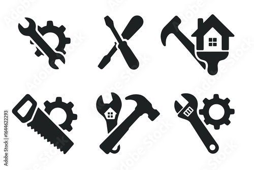 Hand tool vector icon set for repair and construction. Wrench, hammer, saw, and screwdriver symbols with gears and house shapes for home improvement and maintenance service.