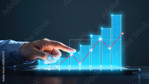 Hand Touching a Glowing Bar Graph on a Tablet with an Ascending Red Line, Illustrating Business Growth, Financial Success, and Technological Advancement