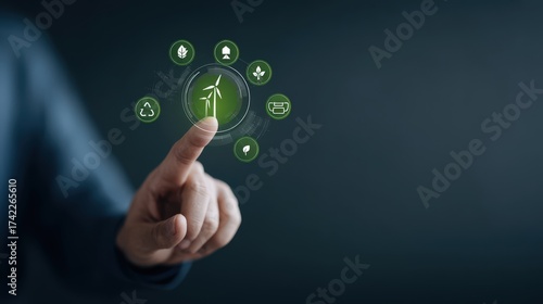Hand Touching Digital Icons for Renewable Energy and Sustainability Concepts in Modern Technology