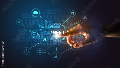 Hand touching THEFT inscription, Cybersecurity concept
