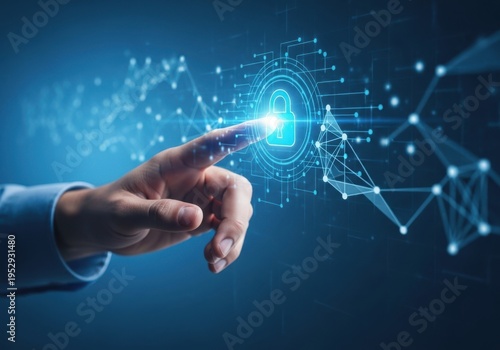 Hand touching virtual network interface with glowing blue connections and nodes online