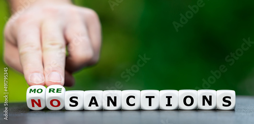 Hand turns dice and changes the expression "no sanctions" to "more sanctions".