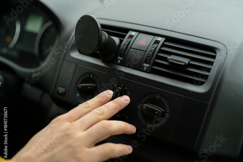 Hand turns the knob to change the temperature in the car while parked in a busy area