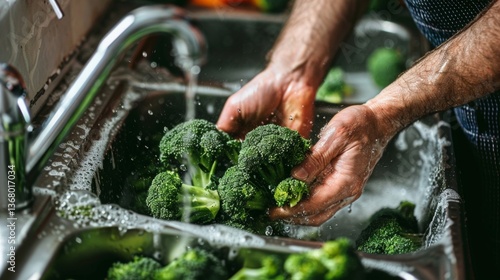 Hand wash fresh broccoli under running water in the sink. Perfect for healthy eating articles, cooking recipes, vegetarianism blogs.