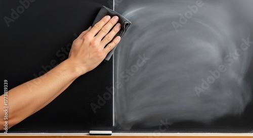 Hand Wiping Chalkboard Clean with Cloth Education Concept CloseUp.