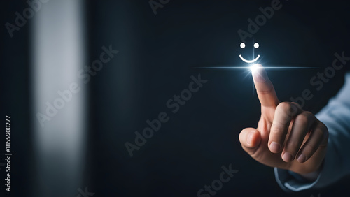 Hand with glowing smiley face in dark background with soft focus and warm lighting for customer satisfaction