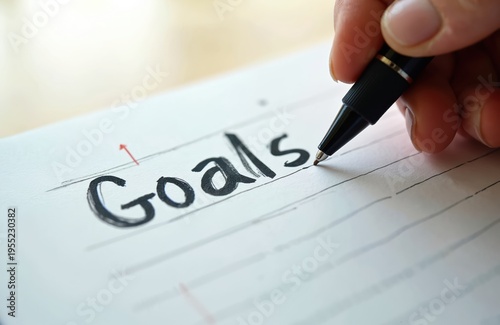 Hand writes goals on lined paper with pen. Planning future achievements and setting new resolutions. Personal development and motivation for success.