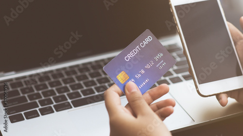 Hand, young woman using a smartphone, register to place an order Pay by credit card