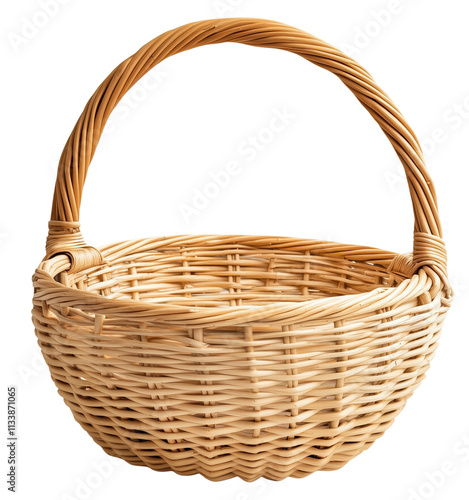 Handcrafted Wicker Basket with Curved Handle for Storage and Decor isolated on transparent background.