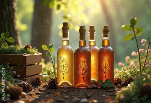 handcrafted wine bottles surrounded rustic nature elements artisan craftsmanship organic forms, cup, glass, grape, plant, texture, stone, soil, barrel