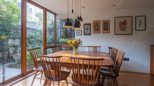 Handcrafted wooden dining set in a bright room with large windows and natural light