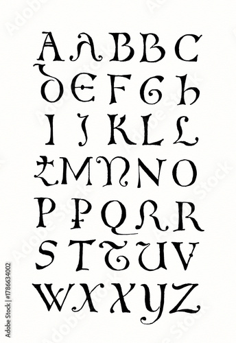 Hand-drawn alphabet created with ink and pen. Artistic black lettering in elegant ornamental style on white background.