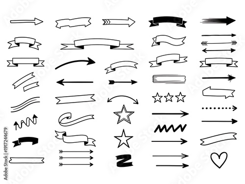 Hand-drawn arrow and ribbon doodles, perfect for design elements and adding emphasis.