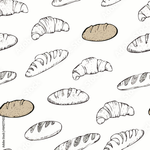 Hand-Drawn Bread Pattern Vector – Line Art Style with Croissants, Baguettes, and Pastries