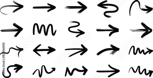 Hand-drawn brush arrows vector set, abstract curved arrow icons, creative black sketch direction symbols, isolated doodle style arrows art