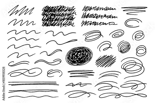 Hand-Drawn Brush Strokes, Arrows, Scribbles and Textured Ink Shapes Set – Abstract Marker Lines, Sketch Elements, Doodle Symbols and Grunge Design Collection
