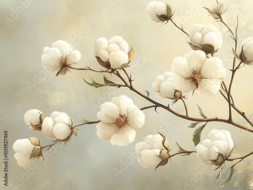 hand-drawn illustration of a cotton branch displaying graceful blooms and delicate fibers, emphasizing the beauty of nature and the textile industry in a soft, artistic style