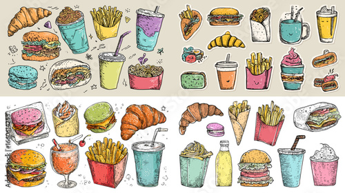 Hand-drawn illustration of delicious fast food items including burgers, fries, croissants, drinks, and desserts. Perfect for cafe branding, menu design, and food packaging.