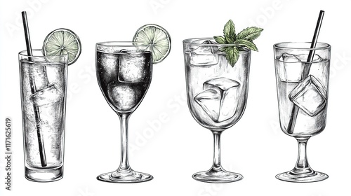 Hand-drawn illustration of four refreshing iced cocktails in different glasses with lime and mint garnishes.