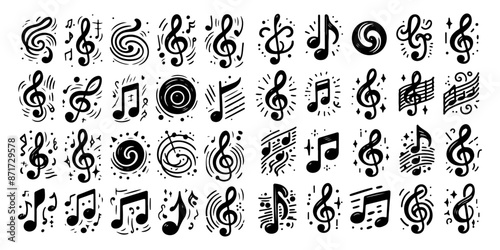 Hand-Drawn Music Note Icons: Vector Set with Treble Clef. Music notes hand drawn black signs vector set. Isolated hand-drawn music note icons on white background. Music note symbols . Vector