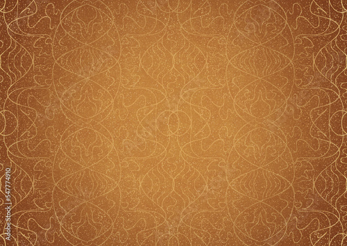 Hand-drawn unique abstract ornament. Golden splatters and light yellow on a darker yellow background and vignette in golden glitter on a darker background color. Paper texture. A4. (pattern: p02-1b)