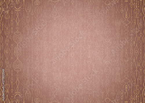Hand-drawn unique abstract ornament. Light semi transparent pale pink on a pale pink background, with vignette of same pattern in golden glitter on a darker color. Paper texture. A4. (pattern: p14a)