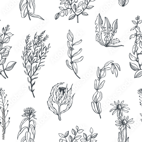 Hand-drawn wild medicinal herbs. Vector seamless pattern.