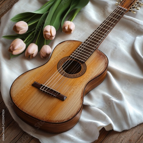 Handmade wooden guitar with pink tulips on a soft white fabric background in a cozy indoor setting. Generative AI