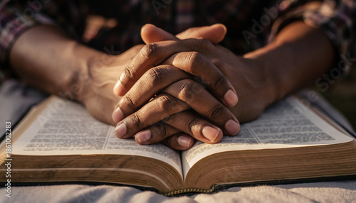 Hands clasped over an open book, possibly in prayer or meditation.
