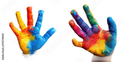 Hands covered in thick vibrant primary colors of paint against a white background