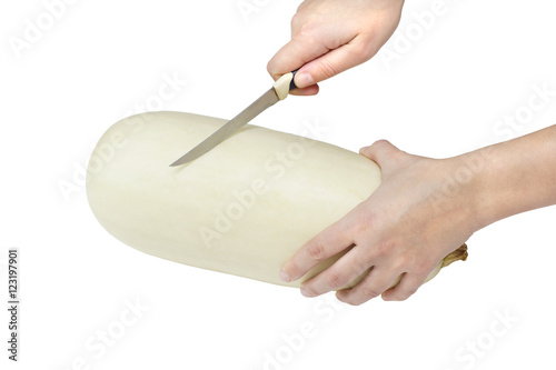 Hands cut a knife zucchini.