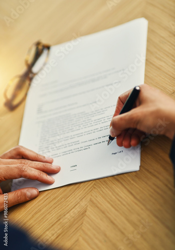 Hands, document and businessperson with signature in office for partnership, agreement or deal. Contract, pen and financial planner signing terms and conditions paperwork for company investment.