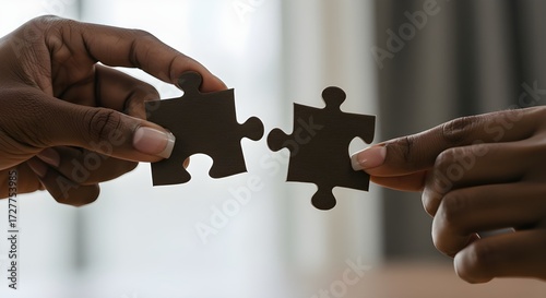 Hands fitting puzzle pieces together on table, symbolizing teamwork, business strategy