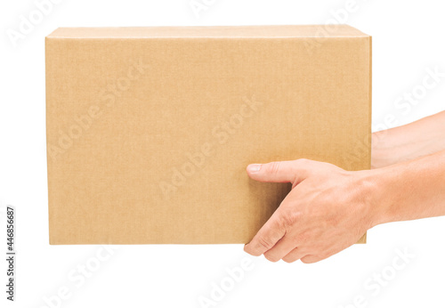 Hands hold corrugated cardboard box on isolated white background