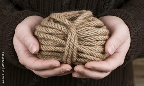 Hands Holding a Ball of Natural Yarn with Texture in Cozy Setting, Ideal for Knitting and Crafting Enthusiasts