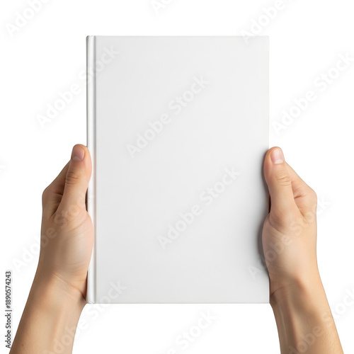 Hands holding a blank book isolated on transparent background