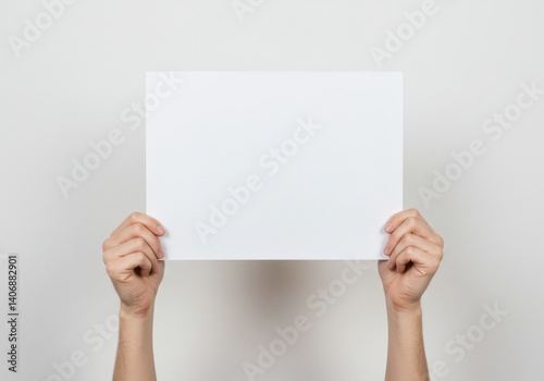 Hands holding a blank white rectangular paper sheet against a plain white background studio shot