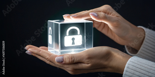 Hands holding a glowing cube with a padlock symbol, symbolizing data security