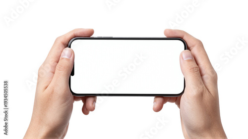 Hands holding a modern smartphone horizontally with blank screen, ready for gaming or watching media